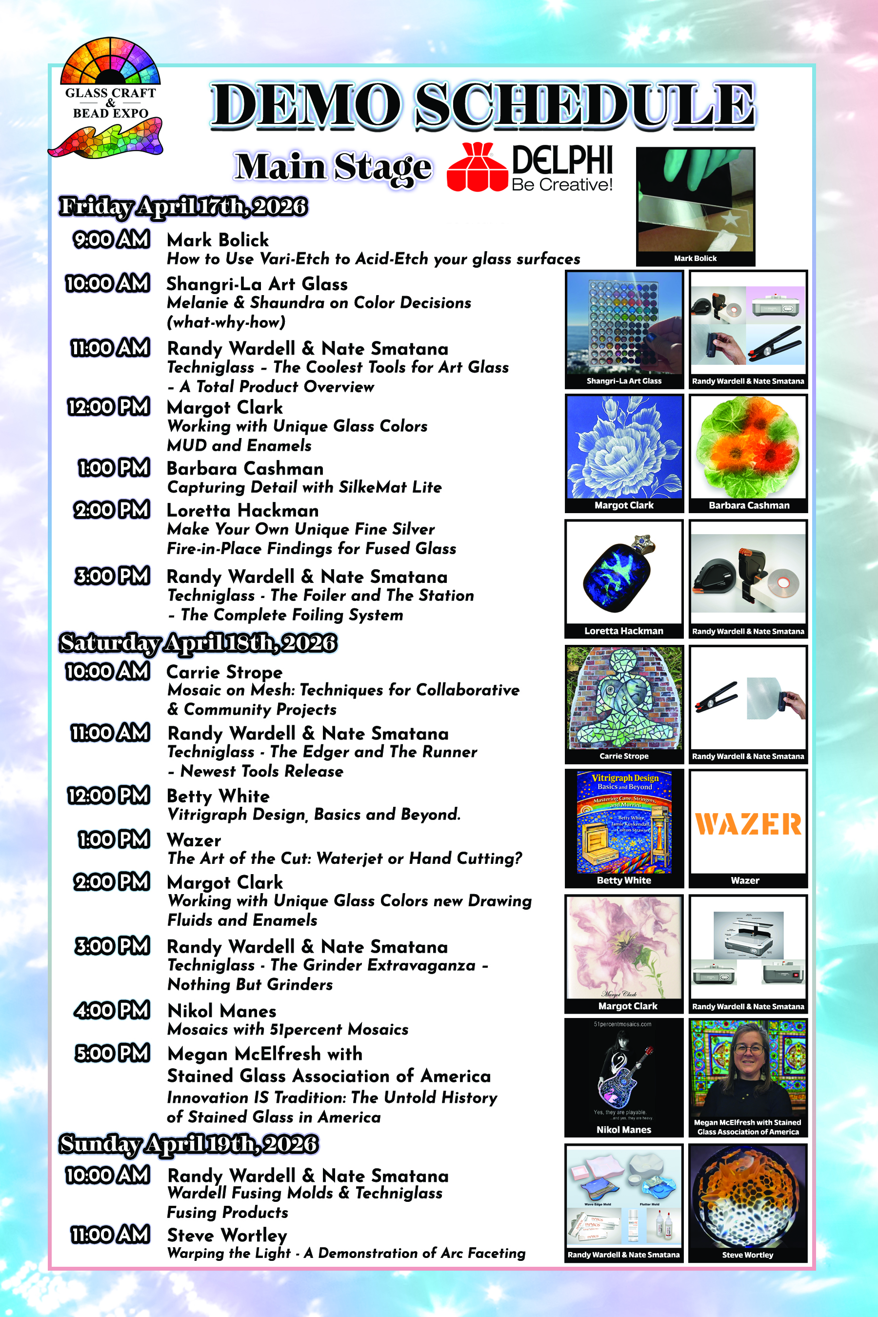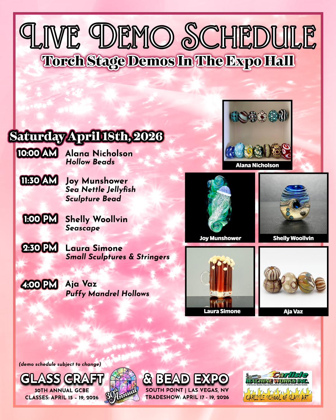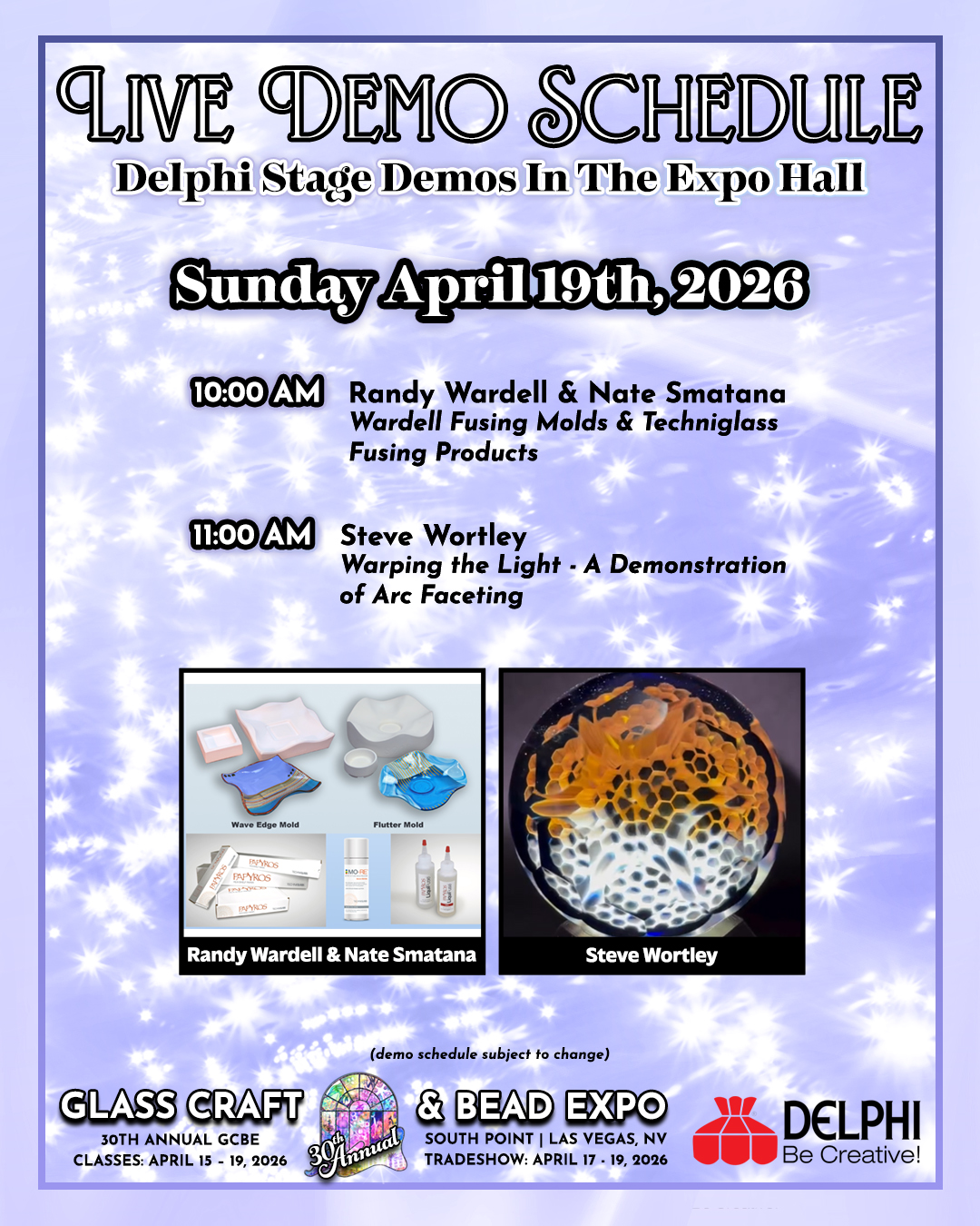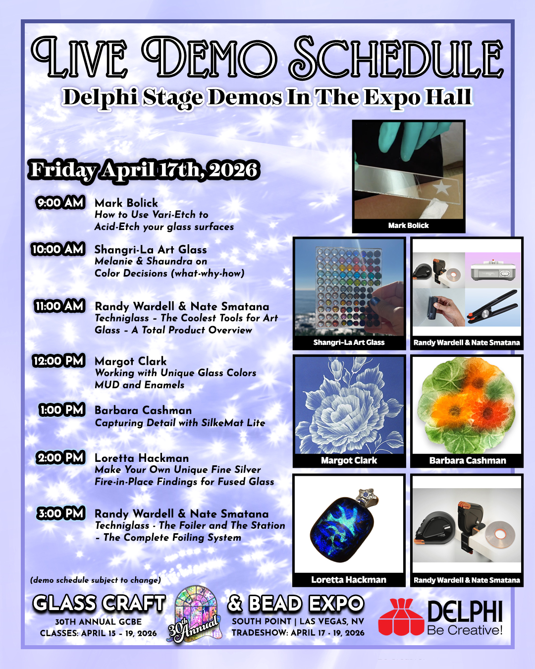 Glass Craft & Bead Expo 2026 is bringing the excitement with live demos on TWO stages! Catch amazing artists in action at the Torch Stage and the Main Stage (Delphi Stage), happening April 17–19 in the Expo Hall. 🔥✨ Check out the full demo schedule below and start planning your must-see moments!