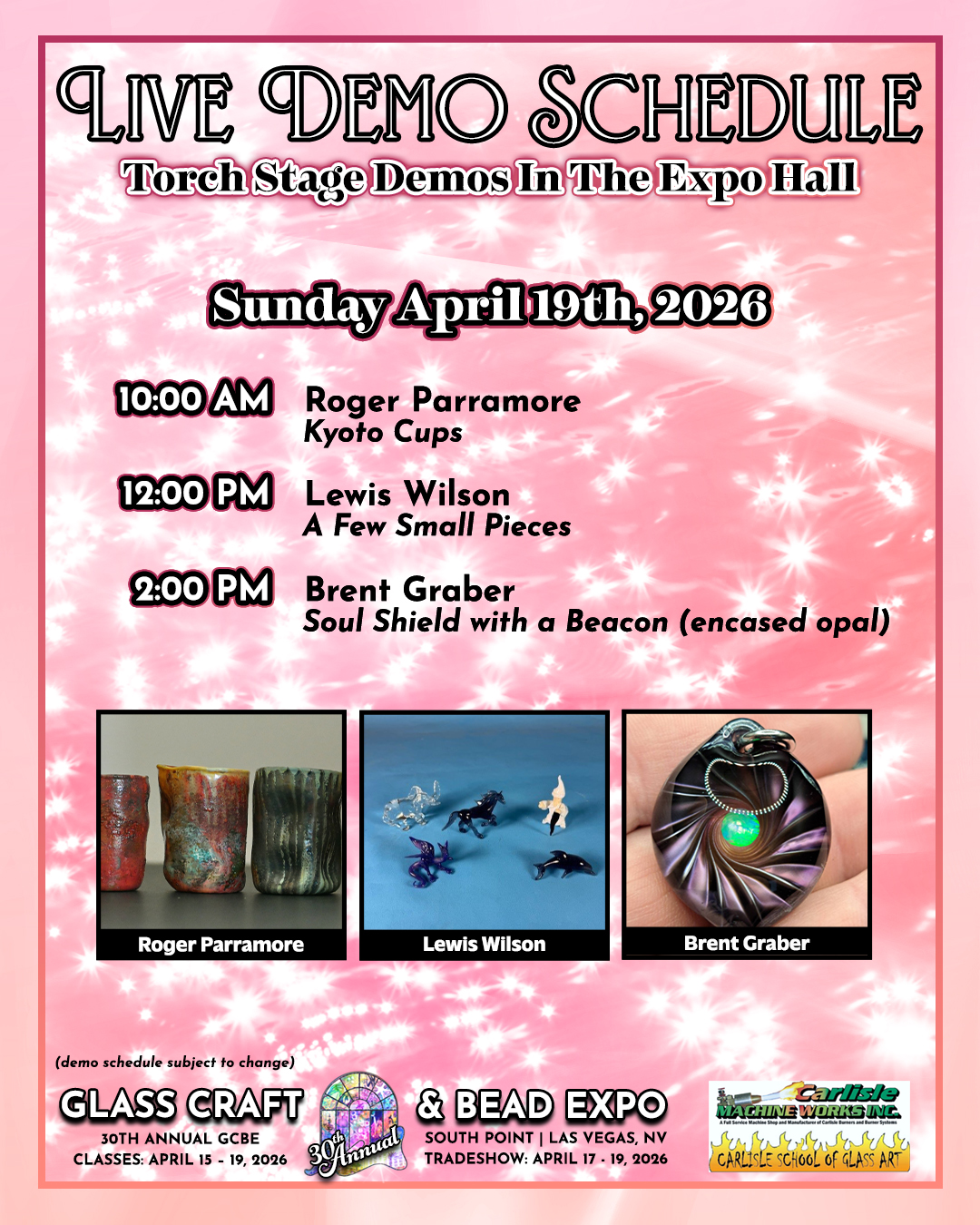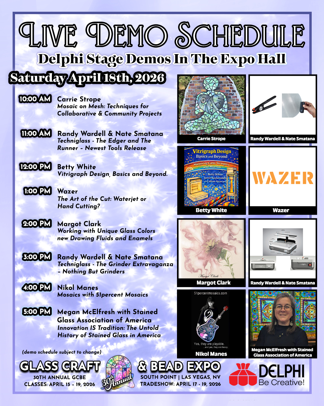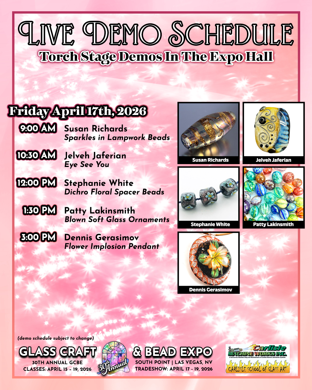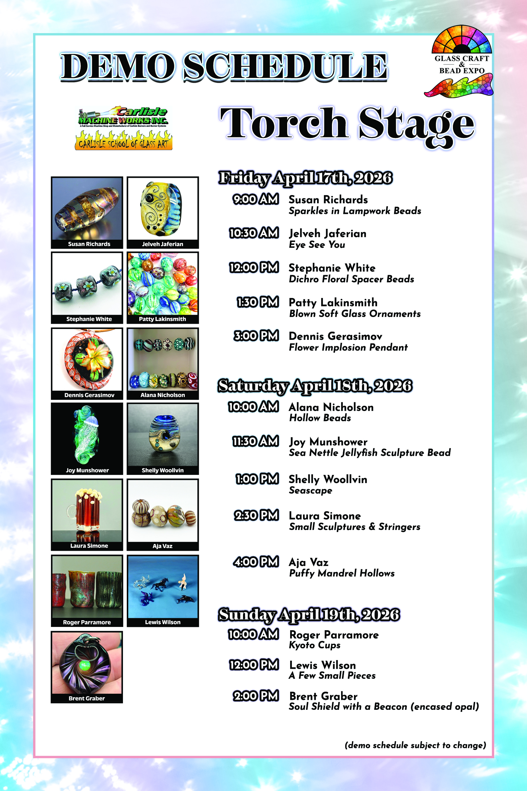 Glass Craft & Bead Expo 2026 is bringing the excitement with live demos on TWO stages! Catch amazing artists in action at the Torch Stage and the Main Stage (Delphi Stage), happening April 17–19 in the Expo Hall. 🔥✨ Check out the full demo schedule below and start planning your must-see moments!