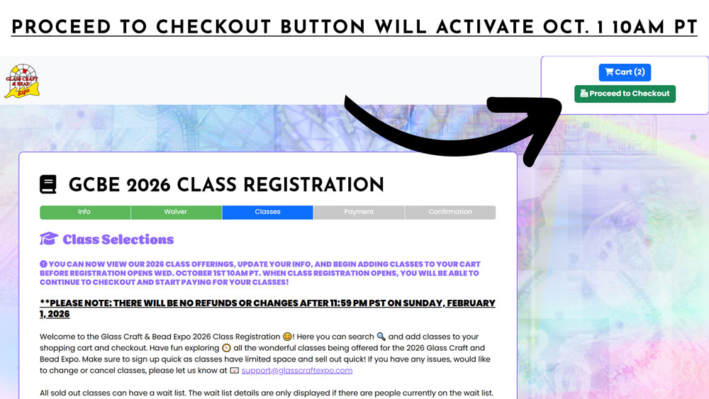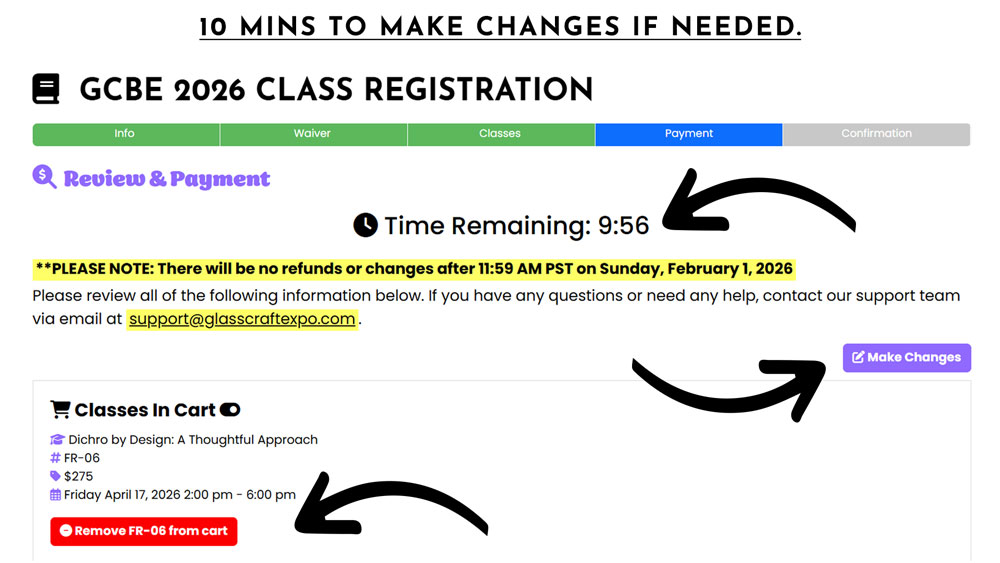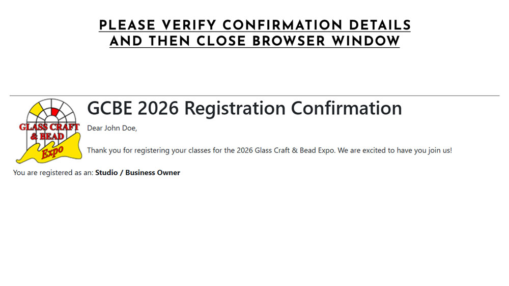 On the confirmation page, review all your registration details and make sure everything looks correct. You will also see the list of classes you signed up for and your transaction history. An email confirmation will be sent to you as well. If everything looks correct, please close out the window in a timely manner. If you notice any issues, feel free to reach out to us at support@glasscraftexpo.com.