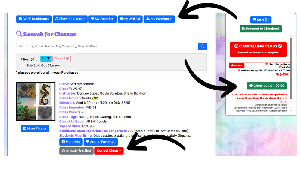 To cancel a class, you must log in to your registration. On the class selection page (where you add classes to your cart) click the "My Purchases" button to view your classes. Find the class you wish to cancel and click the "Cancel Class" button and then click "Cancel & Remove me from Class". This will add the cancelled class to your shopping cart. You must then proceed to checkout and scroll down to the bottom of the page to complete the cancellation by entering in your payment details to complete the refund. If you do not do this, the class will not be completely cancelled.