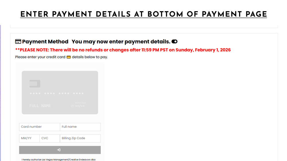 Now that you are on the payment page, you will have about 10 minutes to review your classes, make changes, and enter your payment information. If you take longer then 10 minutes, you will potentially have to enter back into the waiting room queue. Once you verify everything is correct, scroll down to the bottom of the page to enter in your payment information and complete your payment.