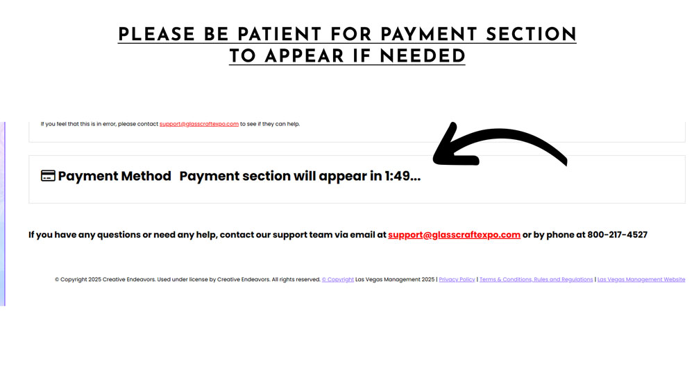 There might be an additional delay for the payment section to appear at the bottom of the page. Please wait and do not refresh the page. Once the time runs out, the payment section will show up for you to enter in your payment details.