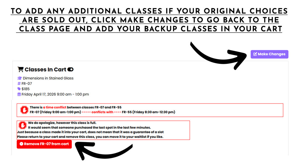 If you have a class in your cart that becomes sold out and you go to check out, you will see a notification under the class information on the payment page that says ‘We do apologize, however this class is full. If you see this message, you must remove the class from your cart and you can either proceed with payment for your other classes in your cart or go back to add your alternative class choice.