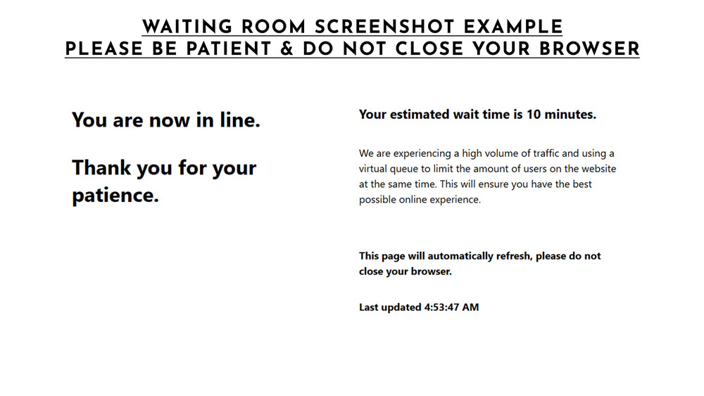 Once you make it to the waiting room, please be patient. There will be an estimated wait time on screen like the screenshot below. Make sure you DO NOT CLOSE YOUR BROWSER as you will potentially lose your spot in the waiting room/queue. Once it is your turn, you will be taken to the payment page.